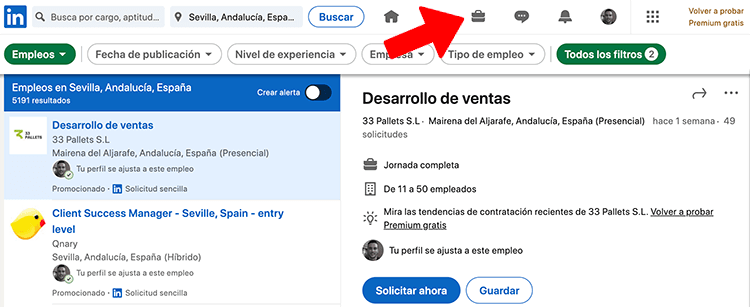Ahí, en la barra superior, en donde hay un maletín tienes una sección de ofertas de trabajo que puedes configurar para buscar oportunidades laborales en todo el mundo.